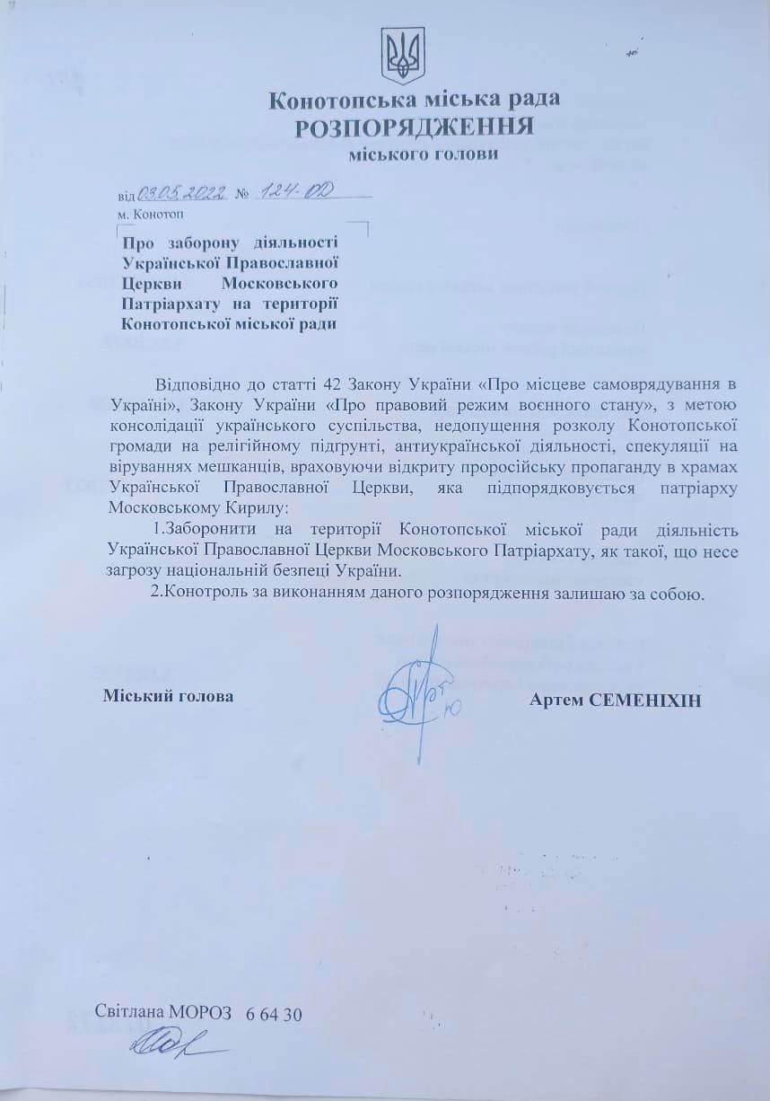 "Заборонити на території Конотопської міської ради діяльність Української православної церкви Московського патріархату як такої, що несе загрозу національній безпеці України", - йдеться в розпорядженні.