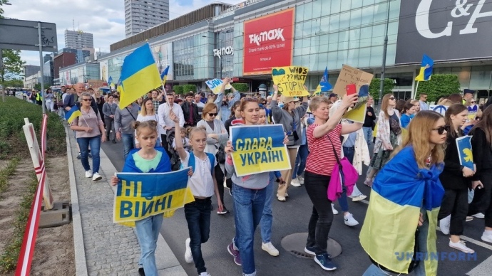 Тисячі людей вийшли в центр Варшави на акцію протесту "Россия, иди на х..", під час якої вимагали врятувати захисників Маріуполя і висміяли армію окупантів.