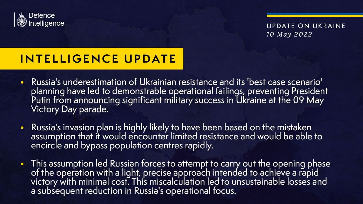 "Недооцінка Росією українського опору та планування за "найкращим сценарієм" призвели до очевидних оперативних невдач, не давши президенту Путіну оголосити про значний військовий успіх в Україні на параді в День перемоги 9 травня", – йдеться в огляді.
