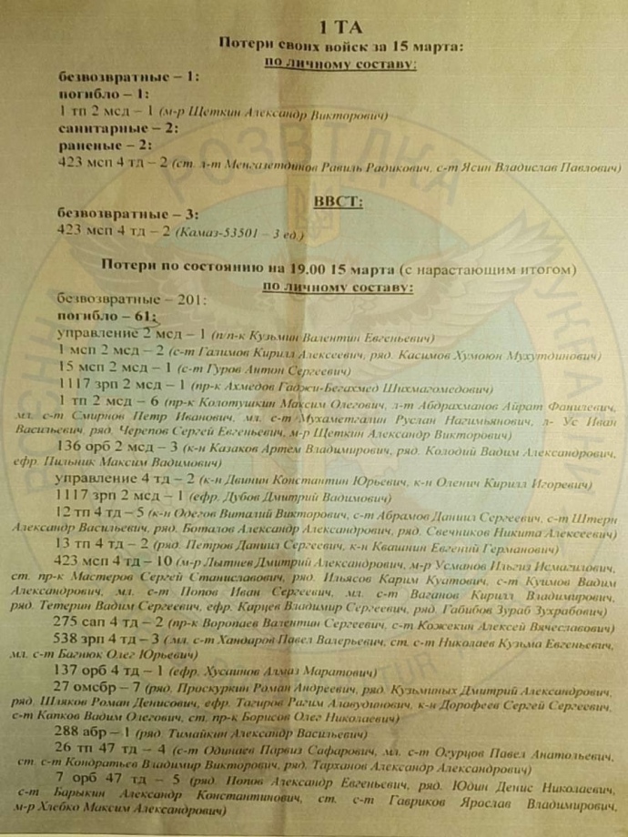Дослівно розвідка: "Воєнна розвідка України здобула документальні підтвердження втрат живої сили та техніки 1 танкової армії збройних сил країни-окупанта.