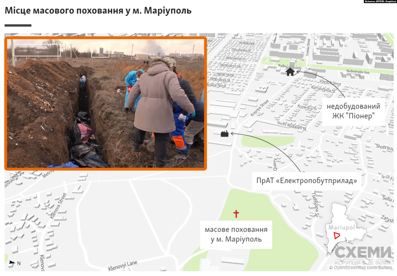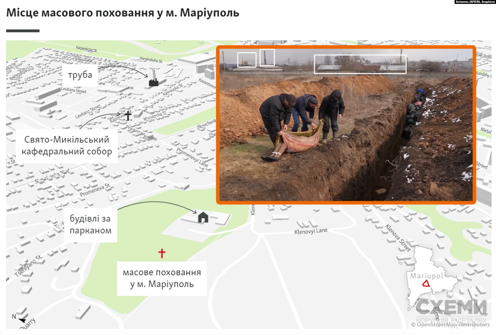 - Наприкінці квітня супутники виявили появу масового поховання на цвинтарі Старого Крима в північно-західному передмісті Маріуполя.
