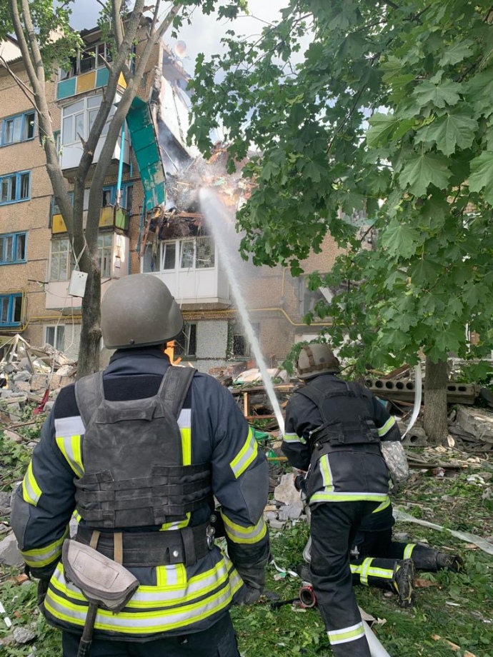 Дослівно ДСНС: "17 травня о 13:30 у м. Бахмут внаслідок ракетного обстрілу сталося влучання у п’ятиповерховий житловий будинок, внаслідок чого в другому під’їзді відбувся обвал конструктивних елементів будинку з п’ятого по перший поверхи з послідуючим загоранням.
