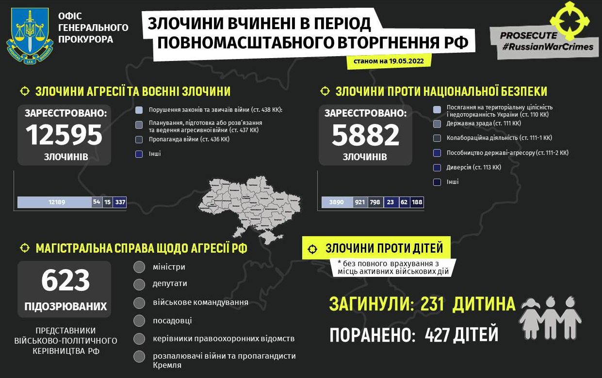 Станом на ранок 19 травня щонайменше 658 дітей постраждали в Україні від рук росіян. Ці цифри не остаточні, оскільки триває робота з їх встановлення в місцях ведення активних бойових дій, на тимчасово окупованих та звільнених територіях.