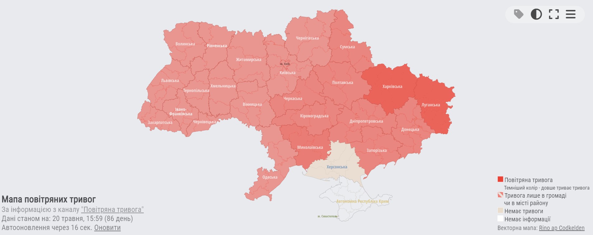Деталі: Станом на 16:00 по всій території України, окрім окупованих Херсонщини та Криму, було оголошено повітряну тривогу.