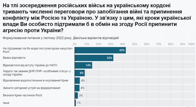 У лютому 2022 року проти будь-яких поступок Росії було лише 43% опитаних. Відмовитися від вступу до НАТО готові були 14%.