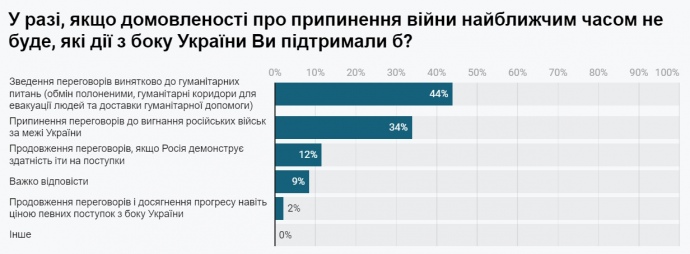 Відносна більшість населення центральних і західних областей України підтримує ідею або повного призупинення переговорного процесу до військового вирішення (34%), або зведення переговорів винятково до гуманітарних питань (44%). За досягнення миру шляхом поступок України у переговорному процесі виступає лише 2% опитаних.
