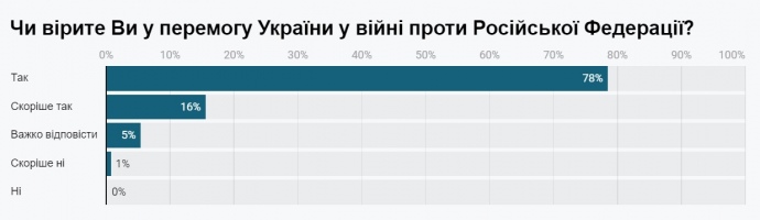 94% громадян, які проживають у західних та центральних областях, вірять у перемогу України в російсько-українській війні. Тих, хто не згоден з цією думкою, лише 1% опитаних.