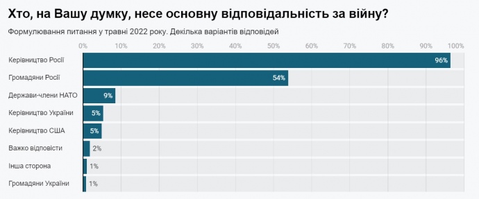 Станом на травень 96% населення західних та центральних областей України вважає, що війна була ініційована політичним керівництвом Росії, ще трохи більше половини (54%) українців покладає відповідальність за війну на росіян.