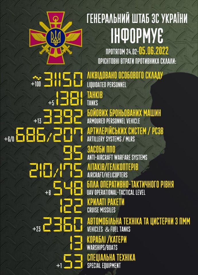 Загальні бойові втрати противника з 24 лютого до 5 червня орієнтовно склали: