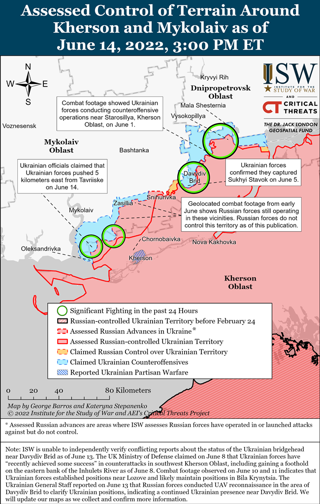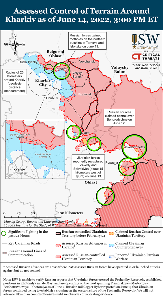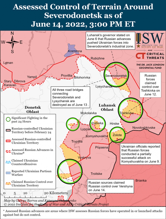 - Російські війська продовжують боротьбу за контроль над заводом "Азот" і знищили всі сполучення між Сєвєродонецьком і Лисичанськом, імовірно, щоб ізолювати українських захисників, що залишилися в місті, від критичних комунікацій.