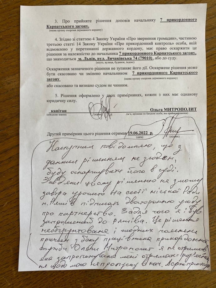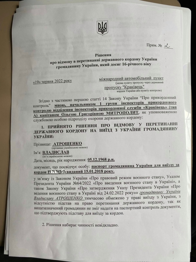 Деталі: За словами Атрошенка, він прямував у місто Ряшів у складі делегації з чотирьох осіб. На митному пропускному пункті "Краківець" меру відмовили в перетині кордону з мотивацію – "не надав відповідних документів, які підтверджують підставу для виїзду за кордон".