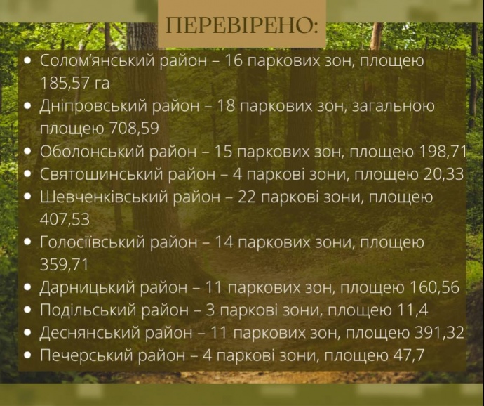 Вказано, що нетехнічне обстеження лісо-паркових зон на виявлення вибухонебезпечних предметів проводили ідентифікатори ВНП Головного управління ДСНС України у Києві спільно із Мобільним рятувальним центром швидкого реагування.