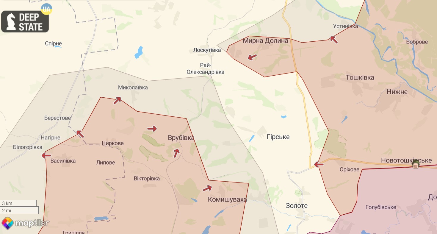 На напрямку Тошківка – Підлісне ворог оволодів населеними пунктами Підлісне та Мирна Долина, закріплюється на зайнятих рубежах. Також має частковий успіх в районі населеного пункту Гірське.