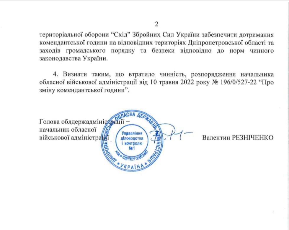 Пряма мова Резніченка: "Скоротили комендантську годину у Дніпрі та Кам’янському. Вона діяла з 23.00 до 5.00. А вже відзавтра (25 червня – УП) на годину менше - від опівночі і до 5 ранку".
