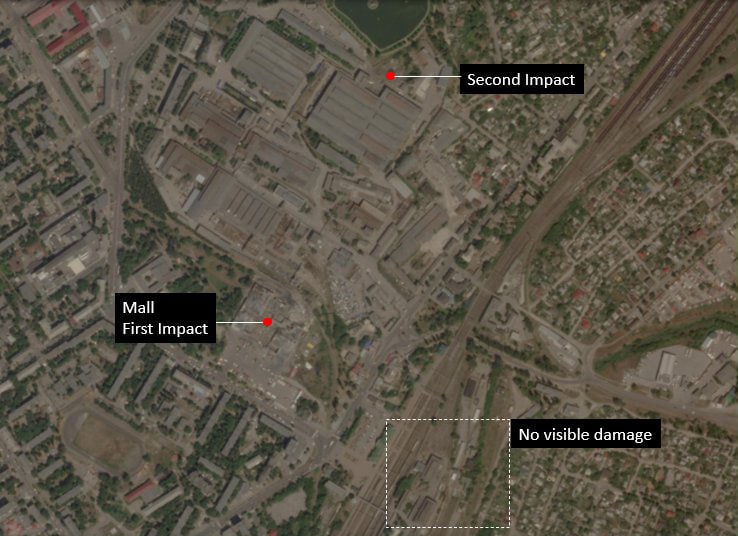Із відео та фото, які проаналізували розслідувачі, видно, що перший ракетний удар був завданий саме по ТЦ "Амстор". Лише після удару по цивільному об’єкту друга ракета влучила в промисловий комплекс.