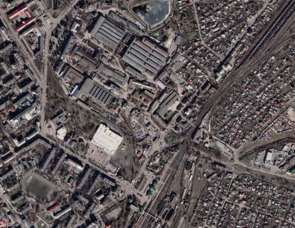На знімку видно, що торговий центр "Амстор" зруйнований вщент, а також зруйнований промисловий комплекс неподалік. Водночас із супутника не видно жодної шкоди залізничній інфраструктурі, яка знаходиться за 300 метрів від знищеного ТЦ "Амстор".
