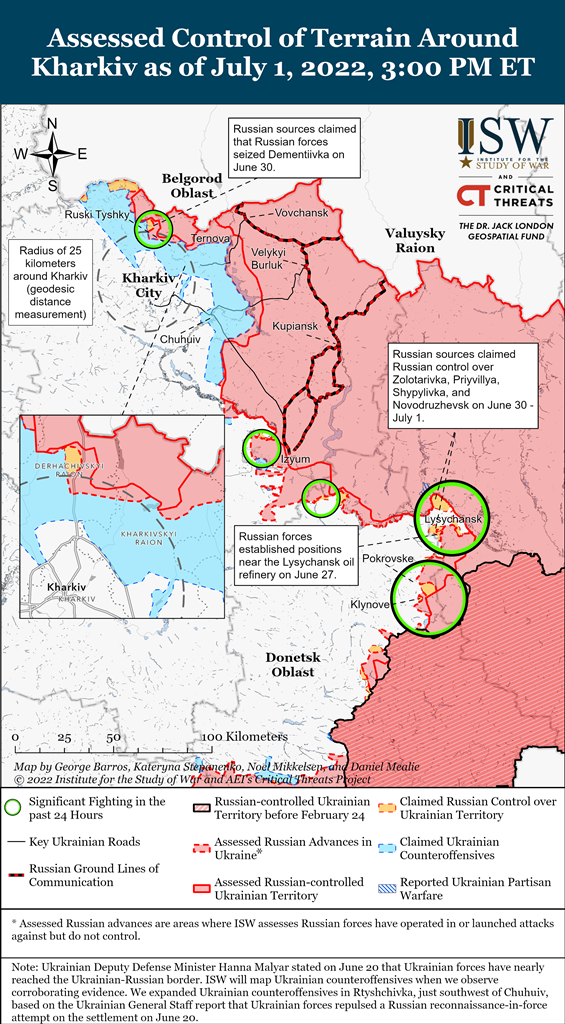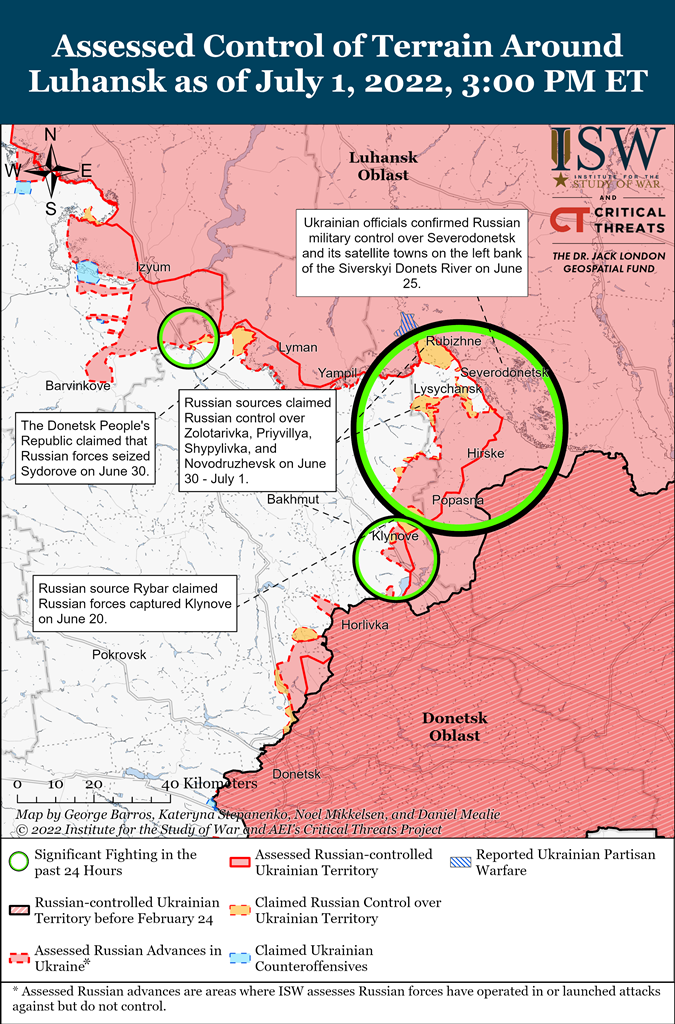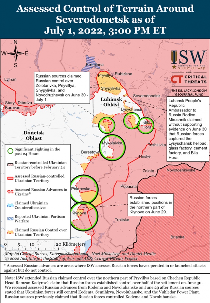 - Російські війська продовжували оточувати Лисичанськ і вели наступальні дії на південь і південний захід від міста.