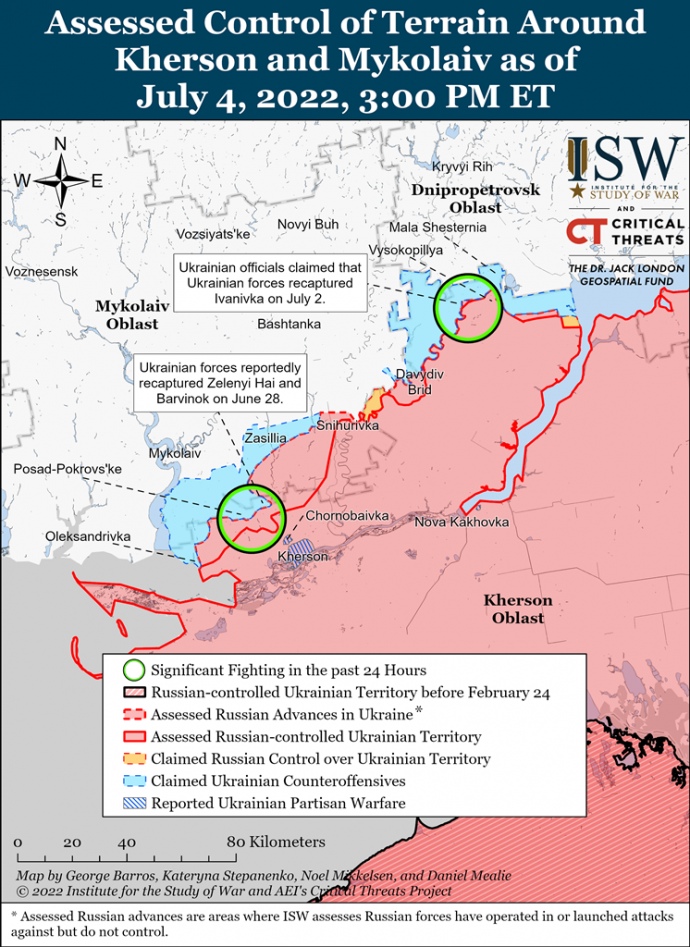 Зокрема, українські сили завдали ударів по російських складах боєприпасів у Дібрівному Харківської області (поблизу лінії фронту) 4 липня та Сніжному Донецької області (приблизно 75 км від лінії фронту) вночі з 3 на 4 липня після удару по одному з чотирьох російських складів боєприпасів у Мелітополі 3 липня.