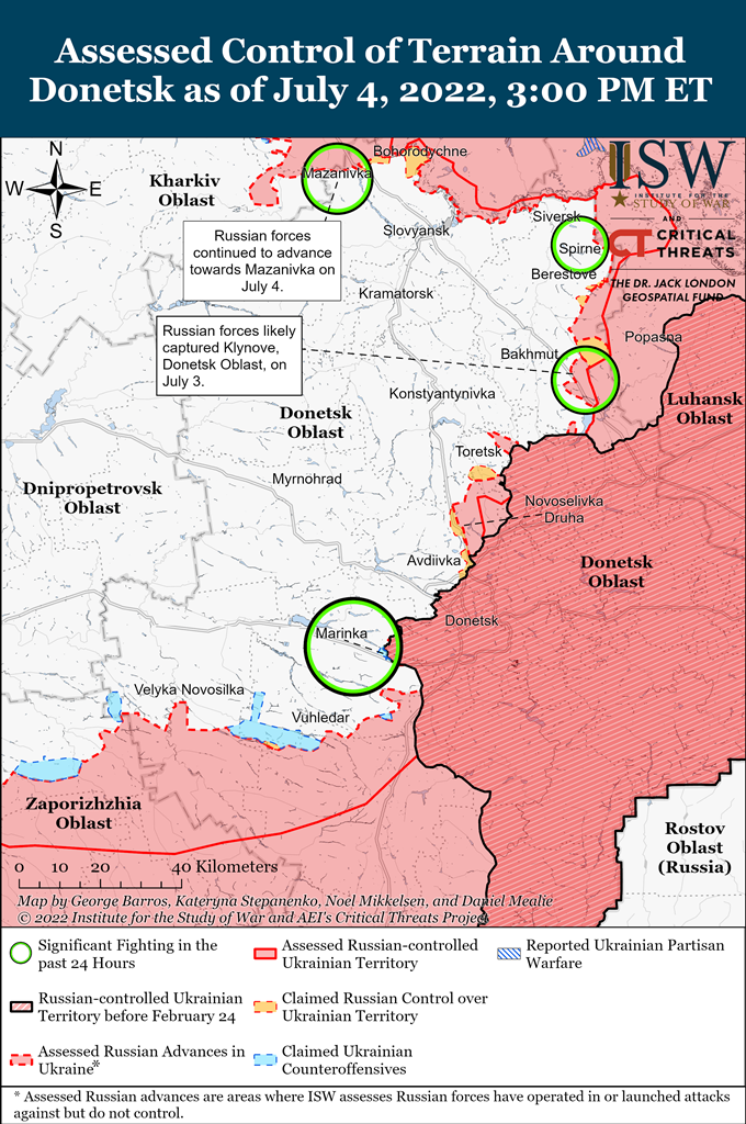 Російські війська, ймовірно, продовжуватимуть просуватися на захід від траси Т1302 Бахмут-Лисичанськ, щоб зрештою пройти до Бахмута і Сіверська, хоча їхня здатність зробити це успішно після втрат, понесених під час спроби взяти Лисичанськ, є сумнівною.