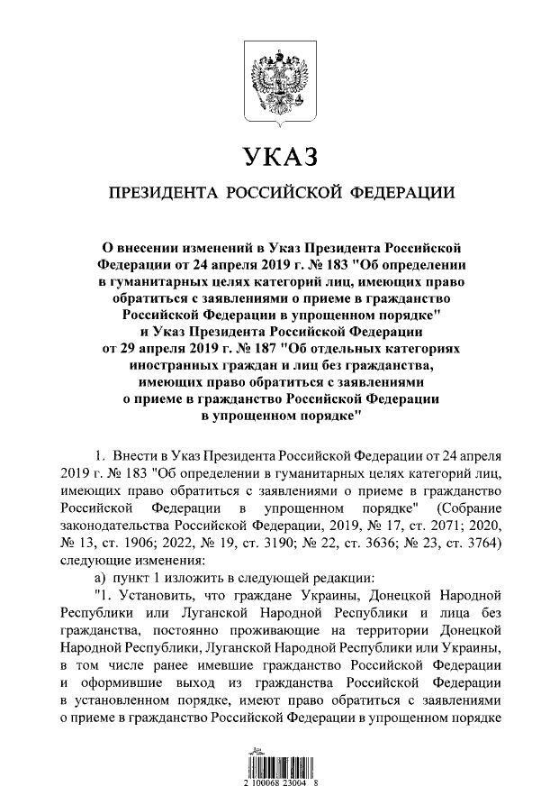 Дослівно: "Встановити, що громадяни України, Донецької народної республіки та Луганської народної республіки та особи без громадянства, які постійно проживають на території Донецької народної республіки, Луганської народної республіки чи України… мають право звернутися із заявами про прийом до громадянства Російської Федерації у спрощеному порядку".
