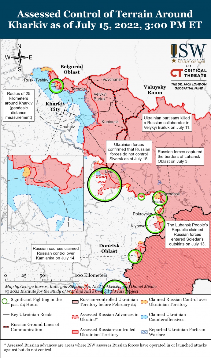 Також ISW зазначає, що російські сили продовжували обороняти позиції у напрямку Харкова, щоб не допустити просування українських військ до кордону з Росією.