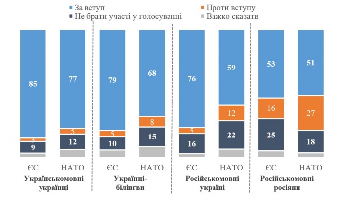 Соціологи зазначають, що значно переважає підтримка вступу до ЄС і НАТО і серед російськомовних росіян: 53% підтримують вступ до ЄС, та 51% – вступ до НАТО.