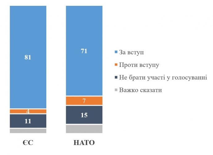 Дослівно КМІС: "У разі проведення референдуму щодо вступу до ЄС 81% серед усіх респондентів проголосували б "за" вступ. "Проти" вступу до ЄС – 4%. Інші (15%) не брали б участь у голосуванні чи не знають, як голосувати. Дещо нижча підтримка у випадку вступу до НАТО, але також переважна більшість українців проголосували б "за" – 71% серед усіх респондентів".