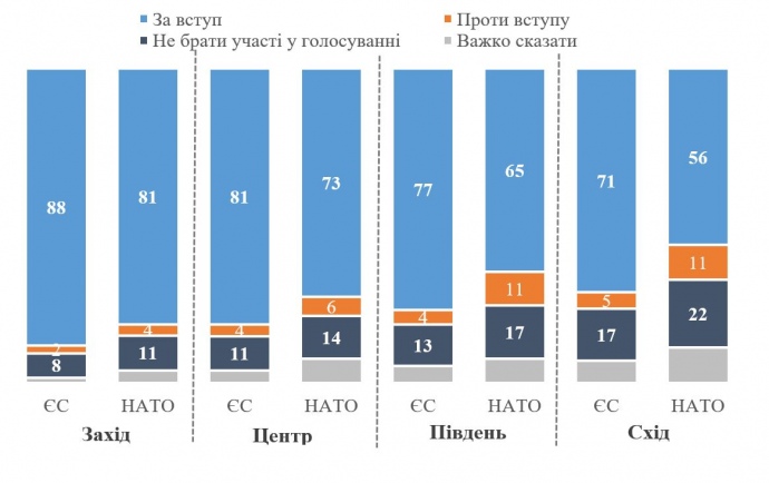 Але навіть серед жителів Півдня і Сходу, відповідно, 77% і 71% серед усіх респондентів підтримали б приєднання України до ЄС та 65% і 56% підтримали б приєднання до НАТО.