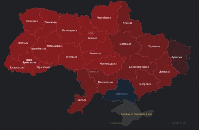 Деталі: Станом на 17.41 повітряну тривогу було оголошено в усіх областях, окрім окупованого Криму і Херсонщини, більша частина якої також окупована росіянами.