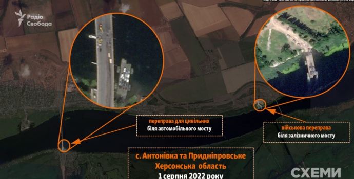Поромна переправа для військової техніки вперше з’явилась на супутникових знімках Planet Labs 1 серпня – її помітили в районі селища Придніпровське Херсонської області, поруч із Антонівським залізничним мостом.