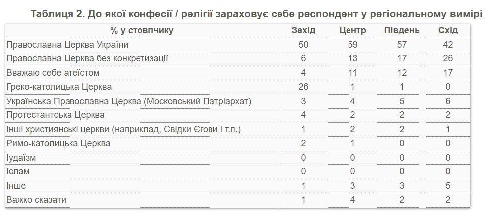 У всіх регіонах найбільше людей ідентифікують себе з православ’ям, а також – саме з Православною Церквою України (від 59% у центрі до 42% на сході). З УПЦ МП ідентифікують себе 3-6% залежно від регіону, при цьому навіть на сході і півдні – лише 5-6%. Водночас із заходу на схід з 6% до 26% зростає частка тих, хто вважає себе православним, але не зараховує до жодного патріархату.