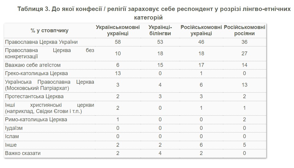 Серед усіх лінгво-етнічних категорій найбільше респондентів ідентифікують себе з ПЦУ. Навіть серед російськомовних українців 36% зараховують себе до саме ПЦУ, у той час як до УПЦ-МП – 13%.