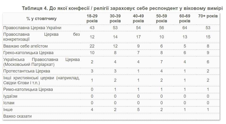 Серед більш молодих більше атеїстів – 22% серед 18-29 річних. Серед 30-39 річних їх уже 12%, а в старших вікових категоріях – ще менше.