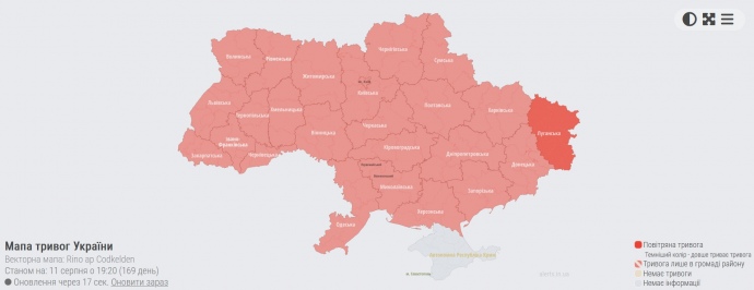 Сигнал повітряної тривоги двічі лунав у всіх областях України протягом вечора 11 серпня.