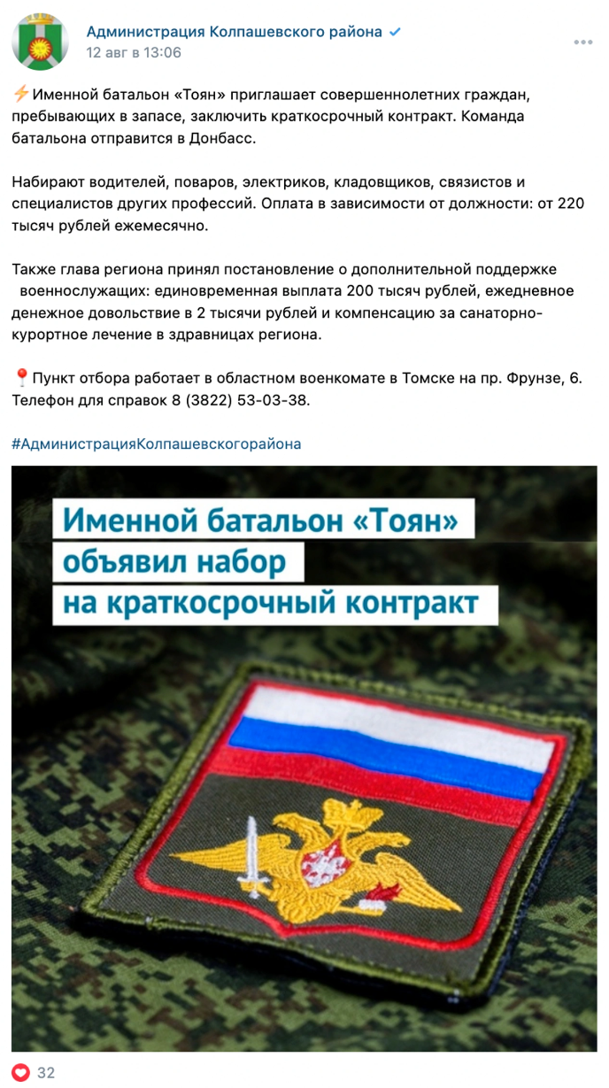 Деталі: Один із працівників підприємства у Томській області передав ЗМІ запис із зустрічі з представниками військкомату, які агітували томичів стати учасниками батальйону "Тоян".