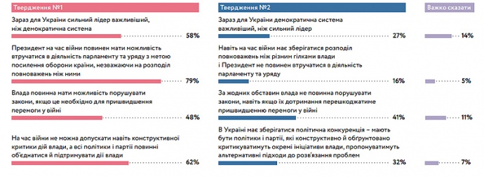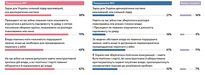 Дослівно КМІС: "Більше респондентів надають перевагу ідеї сильної держави/сильного керівництва, ніж демократії в країні. Також є підстави вважати, що на тлі війни запит на "сильну руку" зростає".