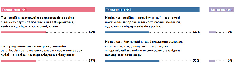 Також 57% респондентів вважають, що під час війни влада має притягати до відповідальності громадян за поширення "шкідливих" для держави поглядів. Водночас 37% переконані, що будь-хто повинен мати можливість публічно висловлювати свої погляди, не боячись переслідувань влади.