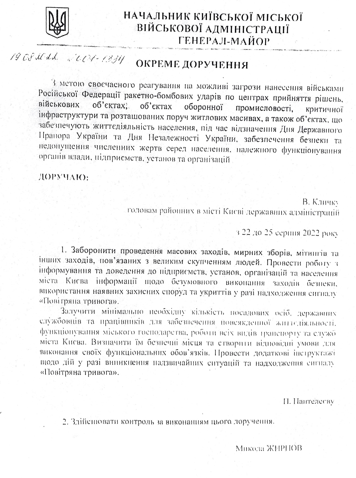 Дослівно: "З 22 до 25 серпня заборонити проведення масових заходів, мирних зібрань, мітингів та інших заходів, пов'язаних з великим зібрання людей".