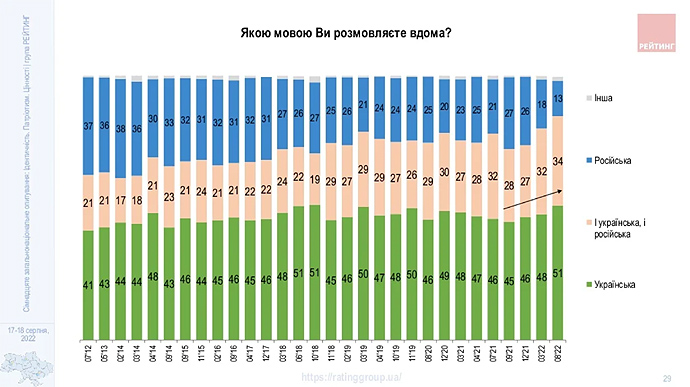 Дослівно соціологи: "Продовжує зростати кількість тих, хто частіше розмовляє українською вдома. Так, сьогодні 51% зазначили, що розмовляють вдома українською (у квітні 2022 – 48%), третина – двома мовами, 13% – російською. Більше половини мешканців півдня і сходу двомовні, близько чверті – російськомовні. Використання російської у побуті зменшилося приблизно вдвічі".