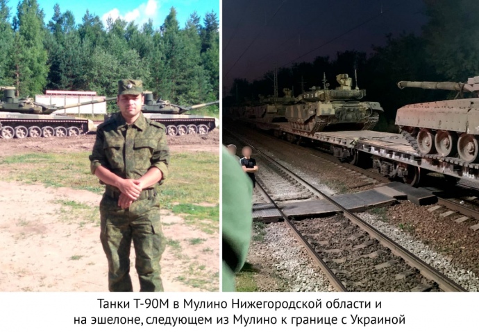 Дослівно: "Останніми днями наші волонтери виявили фото та відео перевезення російської військової техніки залізницею. На відео видно повний склад комплексу "Бук", а на фотографії – танки Т-80БВ та Т-90М. Згідно з базою даних Російської залізниці, обидва склади прямують з Муліно Нижегородської області на залізничну станцію Неклинівка Ростовської області біля кордону з Донецькою областю України.