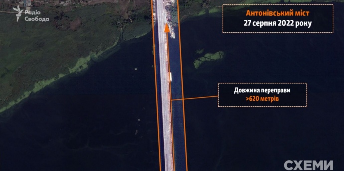 27 серпня супутник Planet Labs зафіксував процес будівництва окупантами понтонної переправи поблизу пошкодженого Антонівського моста: довжина зведеного мосту сягає понад 620 метрів.