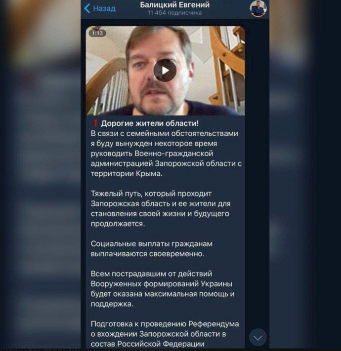Крім того, колаборант із Запорізької області Євген Балицький також повідомив, що збирається "очолювати" регіон із території тимчасово окупованого Криму через "сімейні обставини".