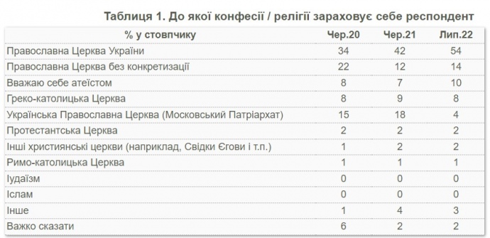 Порівняно з 2021 роком, частка тих, хто ідентифікує себе з Православною Церквою України, зросла з 42% до 54%. Натомість з 18% до 4% знизилася частка тих, хто ідентифікує себе з Українською Православною Церквою Московського патріархату.