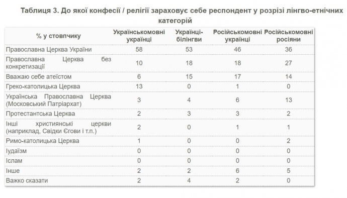 Серед усіх лінгво-етнічних категорій найбільше респондентів ідентифікують себе з ПЦУ. Навіть серед російськомовних українців 36% зараховують себе до саме ПЦУ, у той час як до УПЦ-МП – 13%.