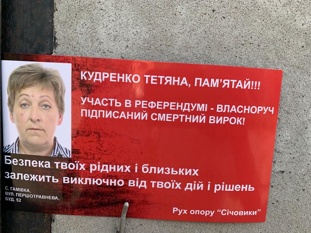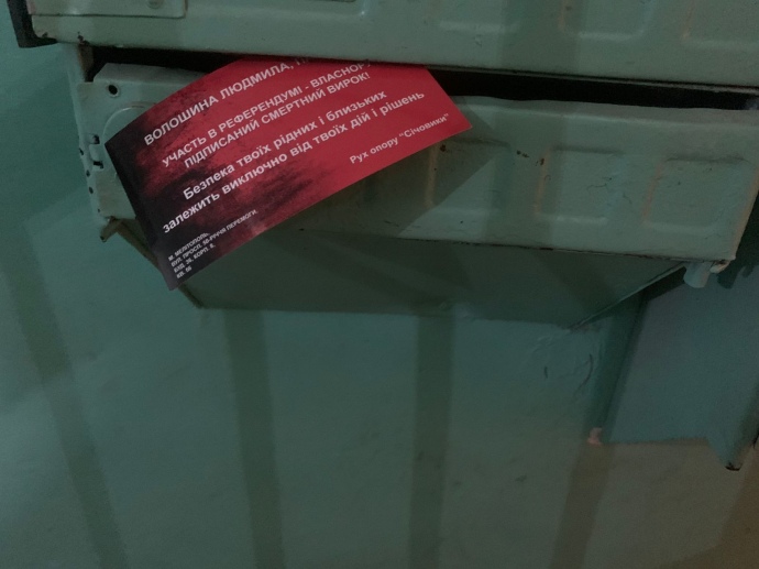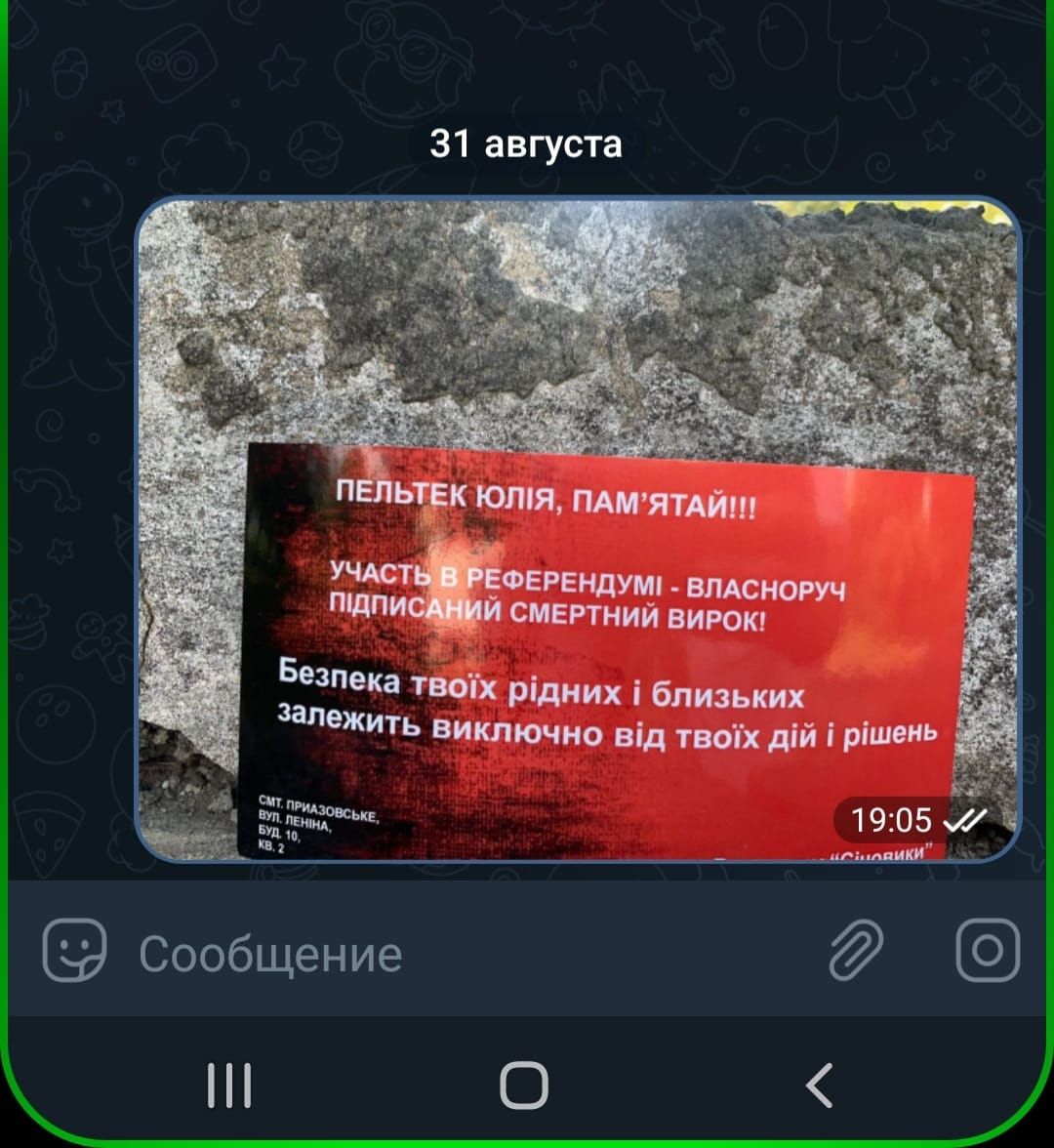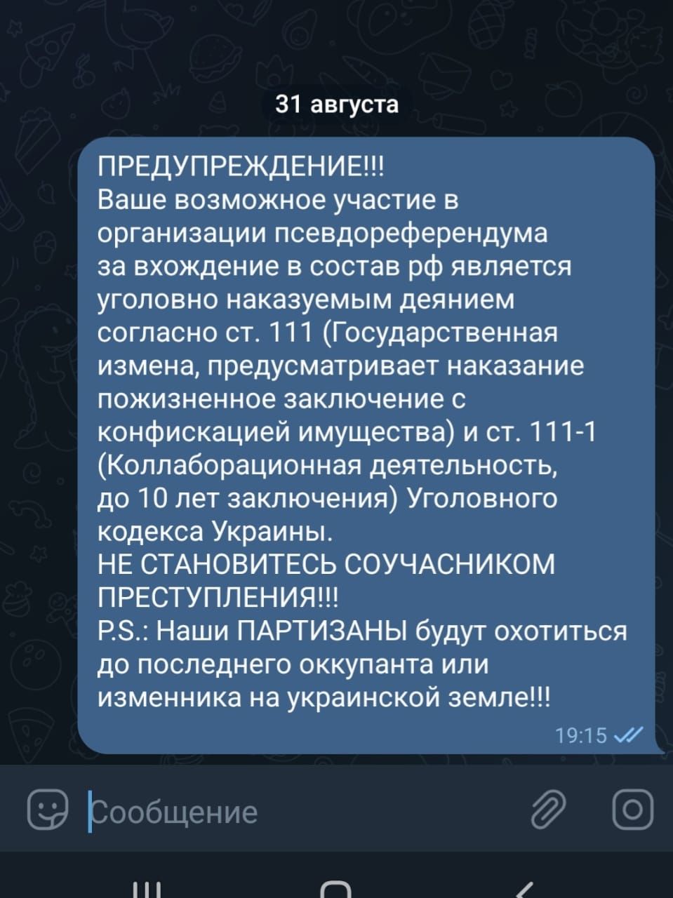 Їм надіслали попередження, що участь у незаконному "референдумі" – це "власноруч підписаний смертний вирок", а також що безпека рідних та близьких цих громадян залежить від їхніх дій та рішень.