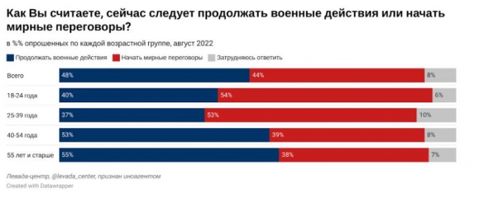 У питанні про те, чи потрібно продовжувати військові дії чи переходити до переговорів, російське суспільство розділилося майже порівну: близько половини росіян (48%) вважають, що необхідно продовжувати військові дії, трохи менше (44%) - що слід розпочати мирні переговори.
