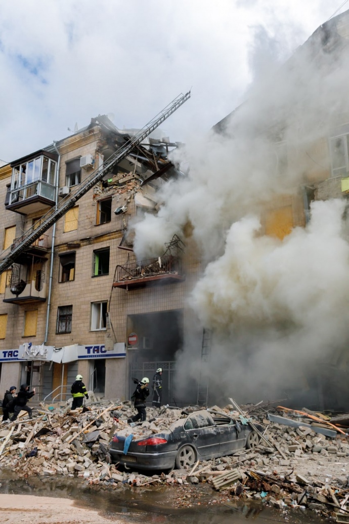 Одна з ракет влучила у дах 5-поверхового житлового будинку, вщент зруйнувавши три поверхи. Наразі тривають роботи з розбирання завалів. На щастя більшість мешканців цього будинку були відселені".