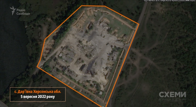 На супутниковому знімку Planet Labs крім зруйнованого понтонного та пошкодженого Дар’ївського мостів, які розташовані поруч, можна побачити пошкодження будівлі біля річкового причалу, де з початку повномасштабного вторгнення Росії стоїть неідентифіковане судно.
