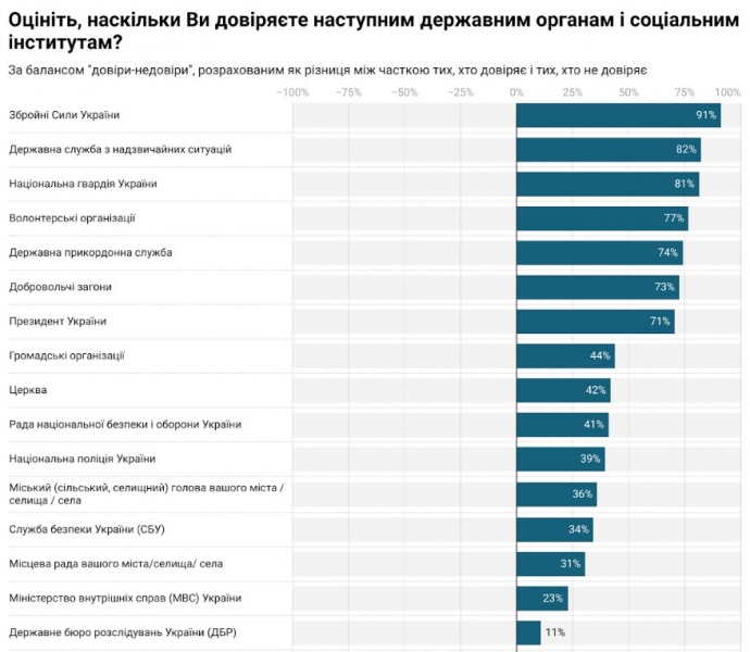 "Станом на серпень 2022 року, найбільший позитивний баланс довіри мають: ЗСУ (91%), ДСНС (82%), Національна гвардія (81%), волонтерські організації (77%), Прикордонна служба (74%), добровольчі загони (73%) та президент України (71%). Найменше ж довіряють українці політичним партіям (-55%), судовій системі (-46%), чиновникам (-46%), комерційним банкам (-37%) та Верховній Раді (-19%)".