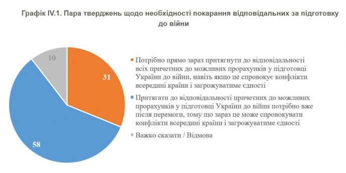 Дослівно: "31% респондентів навіть ціною можливих конфліктів і загрози єдності готові підтримати ініціативу притягнення до відповідальності тих, хто причетний до можливих прорахунків у підготовці до війни.